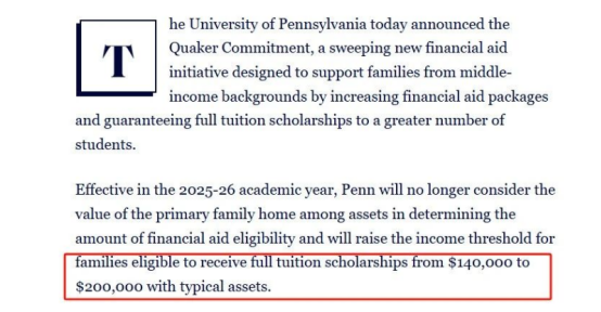 从2025年秋季入学开始,UPenn将对家庭年收入低于20万美元的学生免除全部学费。同时,计算助学金时,不再将家庭主要住房的价值计入资产评估。